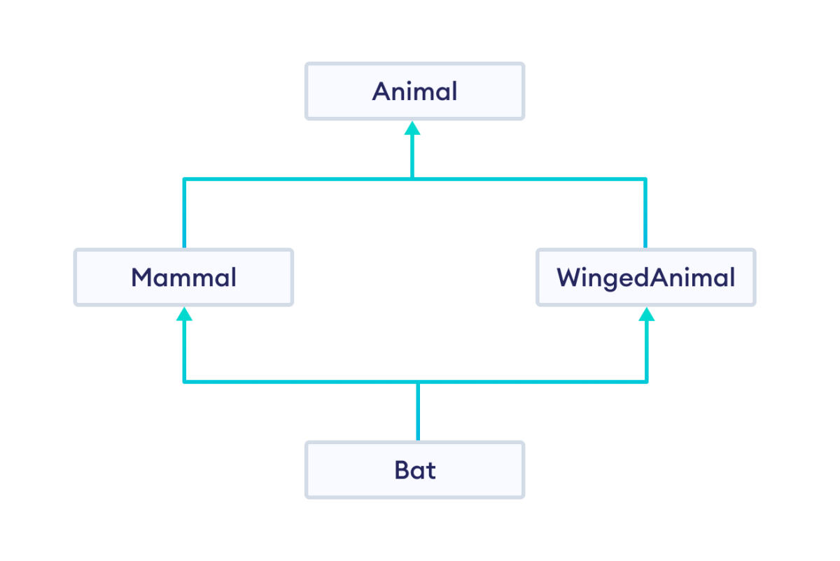 Here, when Bat inherits from multiple classes; Mammal and WingedAnimal having the same base class; Animal, it may inherit multiple instances of the base class. This is known as the diamond problem.