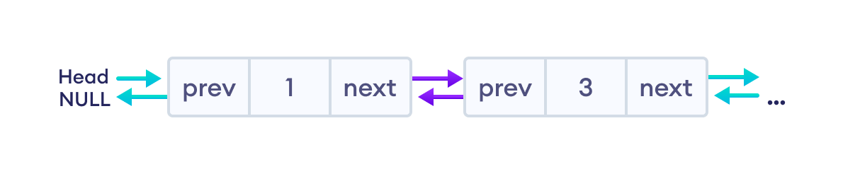 Note: In the case of the head node, prev points to null, and in the case of the tail pointer, next points to null. Here, one is a head node and three is a tail node.