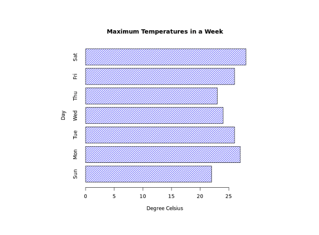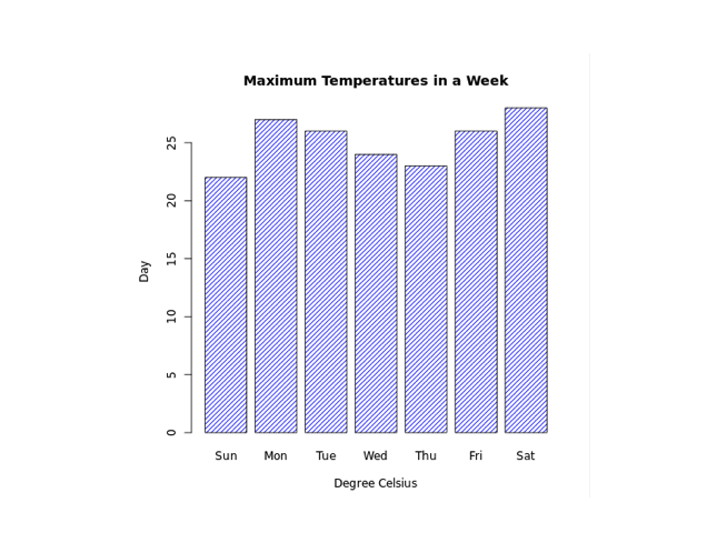 To change the texture of bars in R, we pass the density parameter inside barplot(). For example,